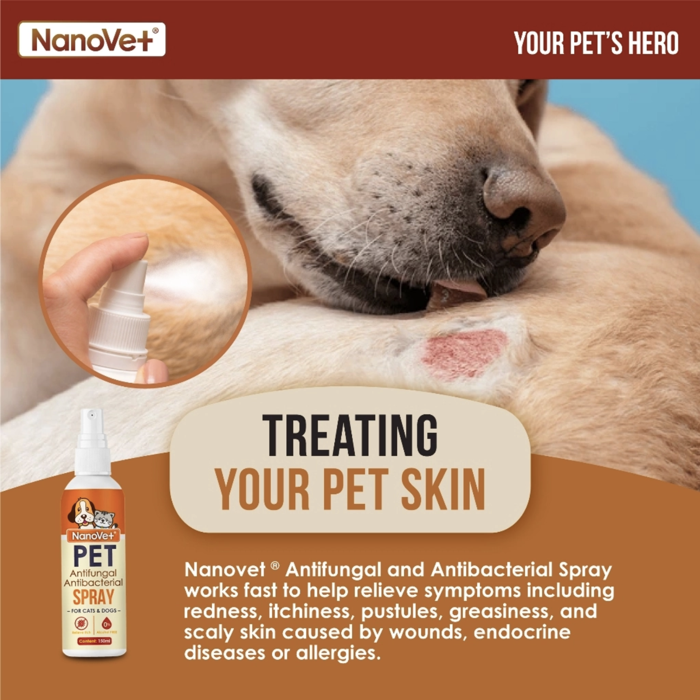 Nanovet™ spray works fast to help relieve symptoms including redness, itchiness, pustules, greasiness and/or scaly skin caused by wounds, endocrine diseases, or allergies.